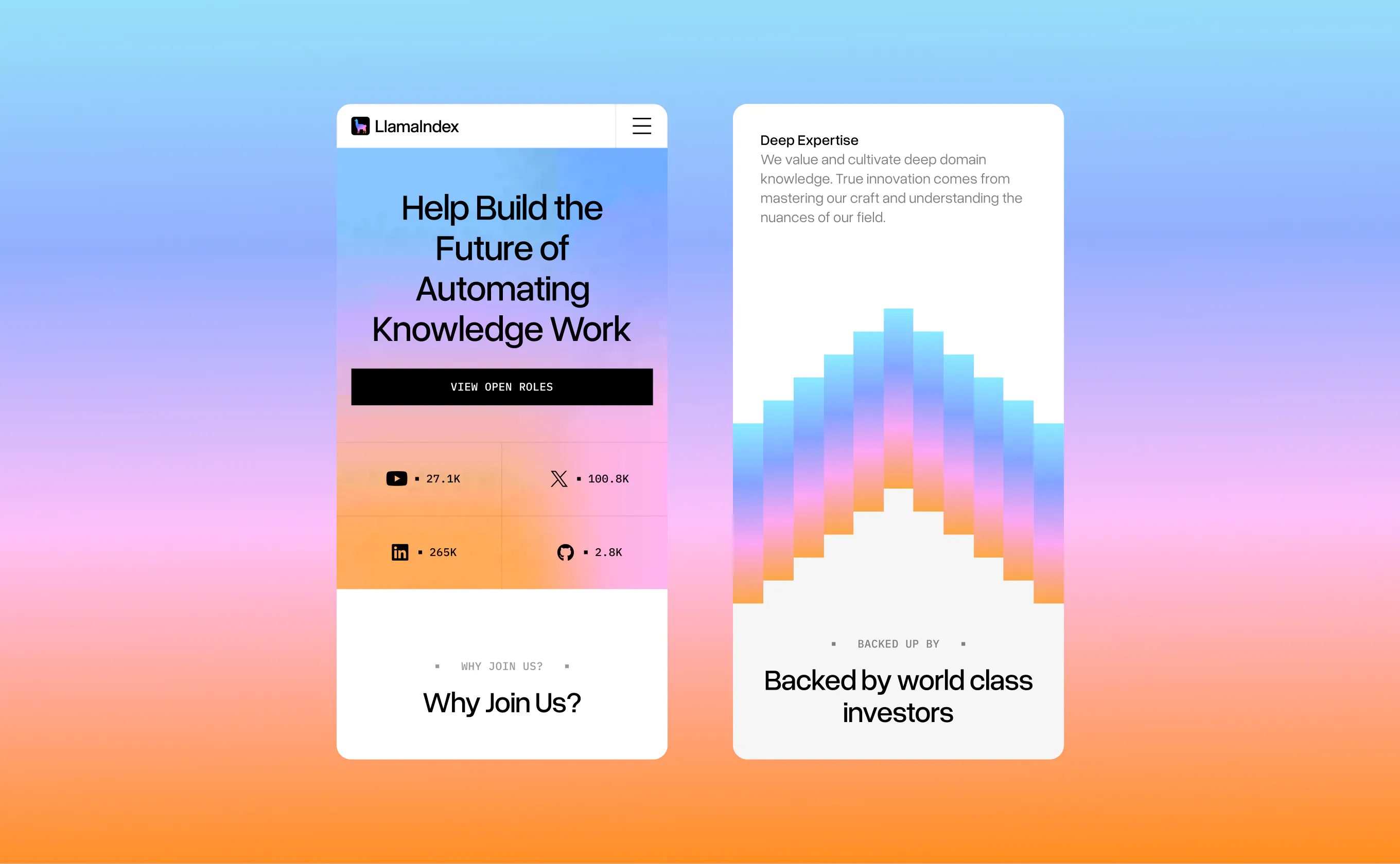 We applied clean, modular layouts to align with the logic-driven mindset of LlamaIndex users. Motion and interaction guide focus without distraction. They also break up dense, text-heavier sections like testimonials and metrics. Gradients subtly form an arrow-like shape that invites users to scroll, with a gentle interactive break.